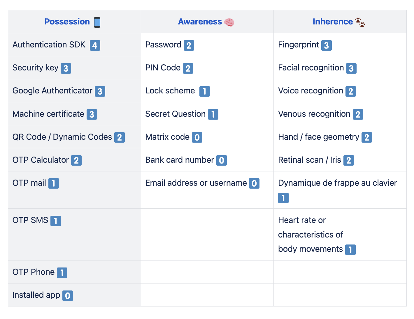 - Add up the scores for each factor (note that a factor of 0 cannot count as a valid authentication factor).